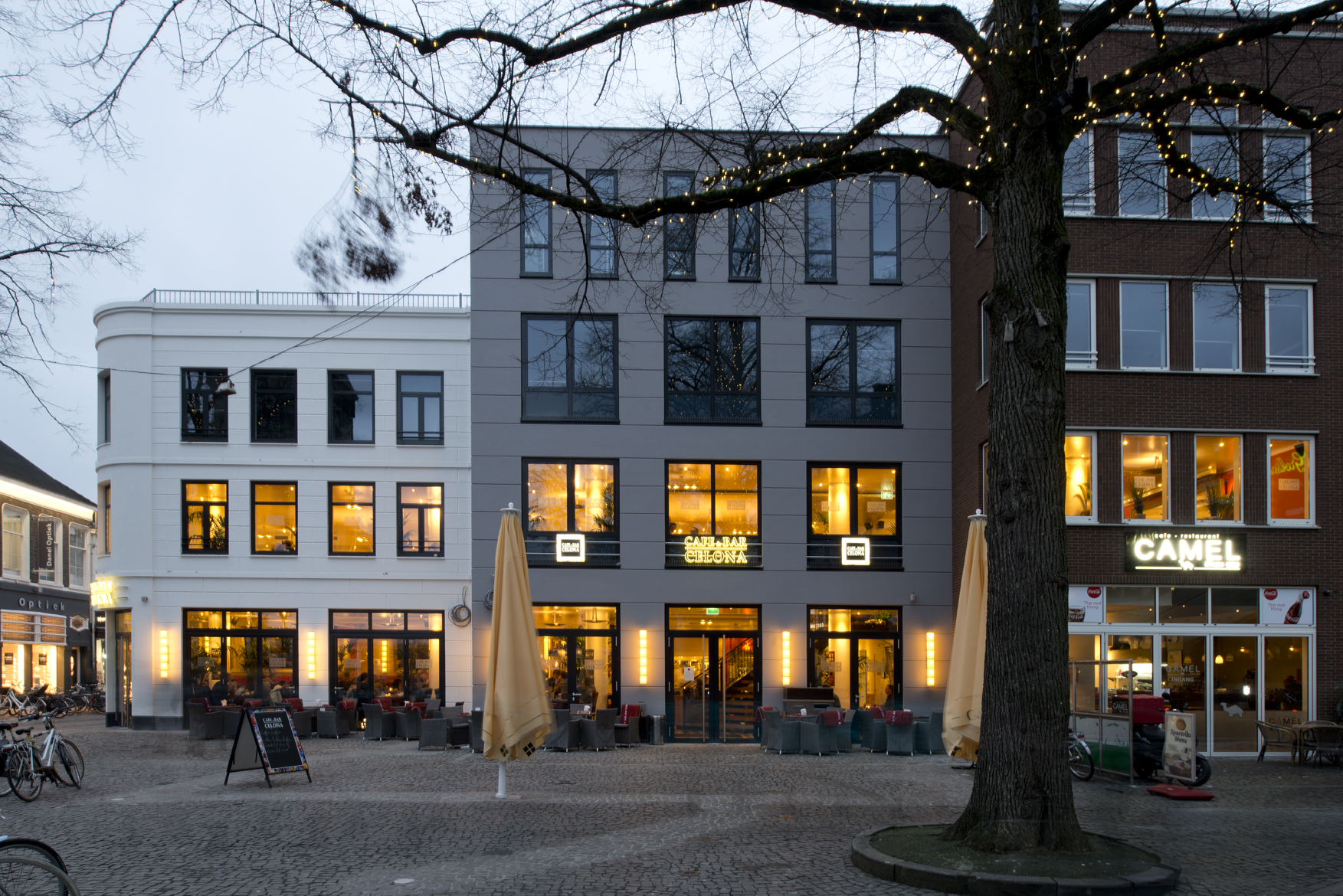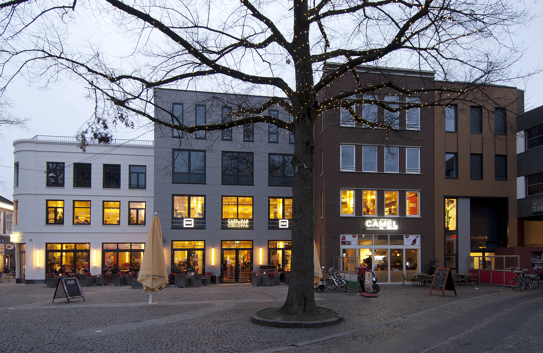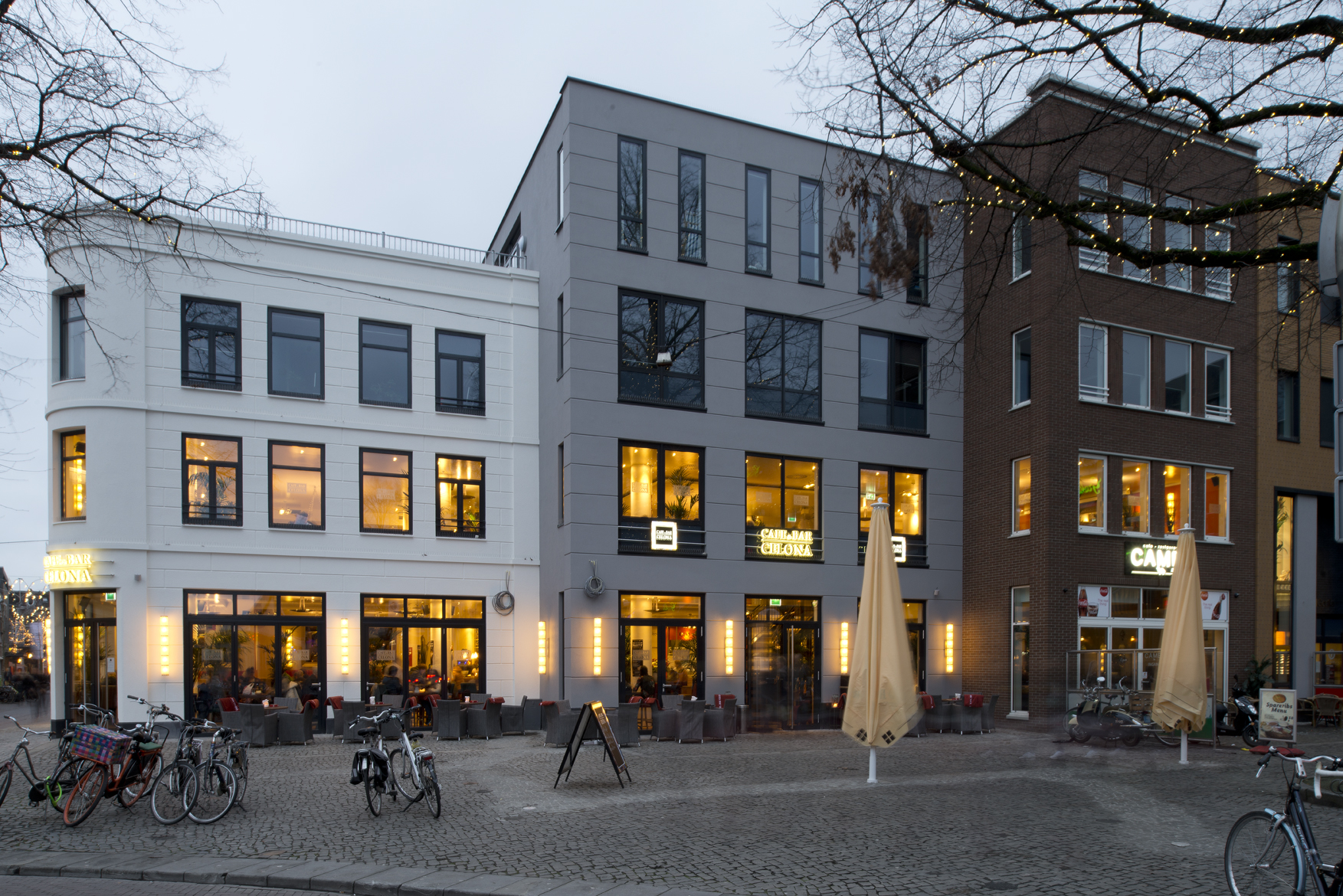 Hoewel het oorspronkelijk één volume betreft van 34 meter breed, is er gekozen om de klassieke maatvoering voor gebouwen uit omstreeks 1900 aan te houden: door uit te gaan van een gevelvlak van maximaal 10 meter breed lijkt het nu alsof er nu vier klassieke panden teruggezet zijn op de Oude Markt in Enschede. Twee daarvan zijn uitgevoerd in een sierpleister afwerking in wit en grijs, de overige twee panden zijn voorzien van minerale steenstrips in horizontale en verticale uitvoering. Op deze manier wordt het pand volledig opgenomen in zijn oorspronkelijke, bestaande omgeving.
