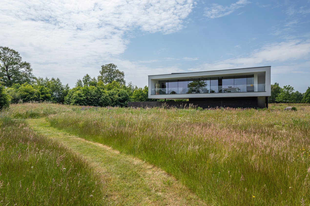 Vooral het landhuis dat bijna zweeft boven het maaiveld springt in het oog. Donkere antracietkleurige keramische stenen markeren de sokkel. Achter deze façade gaan de functionele ruimten verborgen, waardoor de hele eerste verdieping is gereserveerd voor wonen en een panoramisch uitzicht.